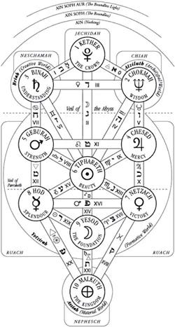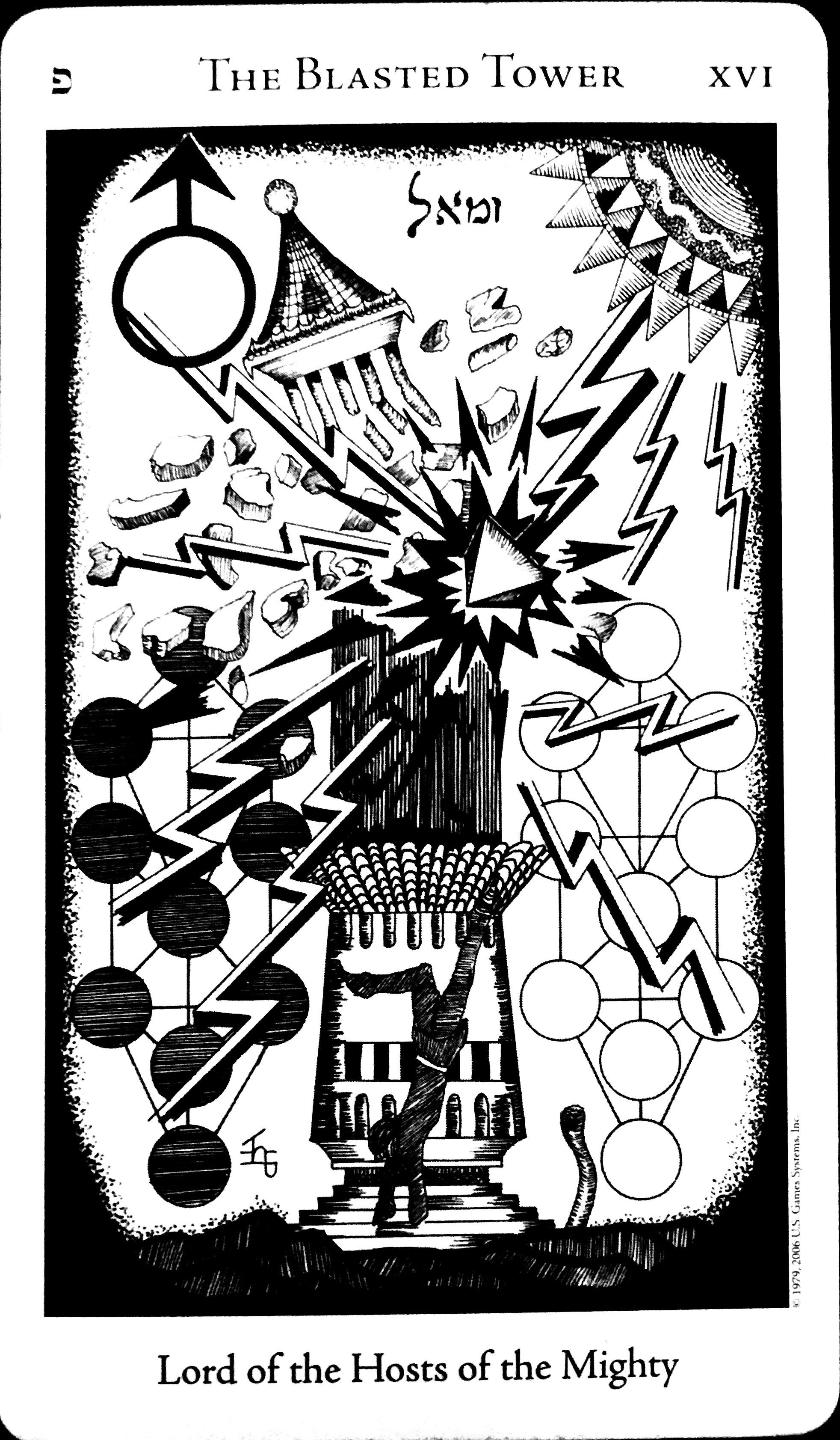 Pey, on the Sephiroth Tree, is the path that connects the Sephiroth Netzach and Hod. Called “Desire” and “Reason,” we can see a clear correlative to Jung’s erotic Anima, and the logical Animus. Also called the “Father and Mother degraded to an animal state”.2 These two spheres fall on the left and right pillars, and it is the path of Pey, one of three paths that cross the center, that connects them. The other two are Daleth and Tet. Daleth is given the Empress card, which symbolism we have already discussed. Tet is the equivalent of Greek Theta, which is commonly used as the variable for the measure of an angle. The significance of this is found within the formula, l = dθ/2, (length of arc equals diameter times measure of angle divided by two). Length of arc (circumference) represented by the vertical masculine L (also the basic form of the Tower card), equals radius, the half diameter and feminine D (English equivalent of Hebrew Daleth) times Theta, The angle and medial relation of the two. Theta also pictorially represents a circle and its diameter, θ. It may also be interesting to add the Greek Delta’s (Δ) (Greek equivalent of Hebrew Daleth) use in mathematics to indicate change, and chemistry to indicate polarity. These mathematical connections are merely suggestive, as they are definitely not intentional. I won’t pretend to any ultimate meaning within them, but give them a synchronistic value.