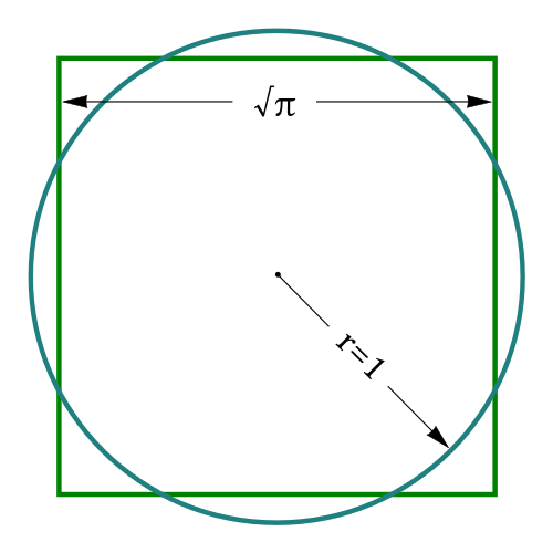 The ancient problem of Squaring the Circle is a deceivingly simple one, but one that has attracted the greatest minds in mathematics and philosophy throughout history, including Archimedes and Anaxogras. The problem lies in being able to construct a square that has the same area of a given circle. Although this problem is currently held to be impossible to solve in any rational way, it is used as a proof that requires Pi to be a transcendental irrational number in order to solve. I am not a mathematician, and so I will refrain from elaborating on the details of the problem so as to not cause confusion in the mind of the reader. What is important is the use of Pi in the relationship between the area of a square and circle.